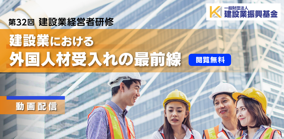 2026年1月23日(金)開催の第32回建設業経営者研修にてご紹介いたしました講演内容をアーカイブ動画で公開することといたしました。 外国人材受入について、優良企業による事例紹介及び講師による制度解説について取り上げております。本動画が皆様の経営改善のお役に立てれば幸いです。ご視聴につきましては、本ページ下の「申込フォームへ」バナーからお申し込み下さい。どなたでもご視聴いただけます。